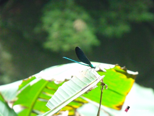 豆娘。屬於昆蟲綱、蜻蜓目,簡言之就是跟蜻蜓是同一家的家人。休息的時候,翅膀會束在背上,就像照片裡這樣。豆娘的體態優美、顏色鮮艷,他的身體是螢光色,類似金龜子發出金屬光澤感,真的是太太漂亮了。