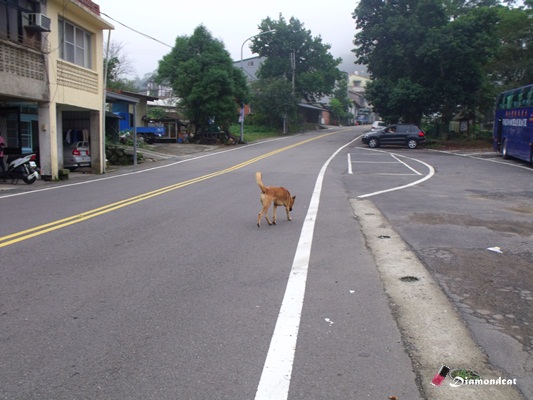 閒晃的小狗,在馬路中間睡覺。沿路幾乎沒有汽車經過。